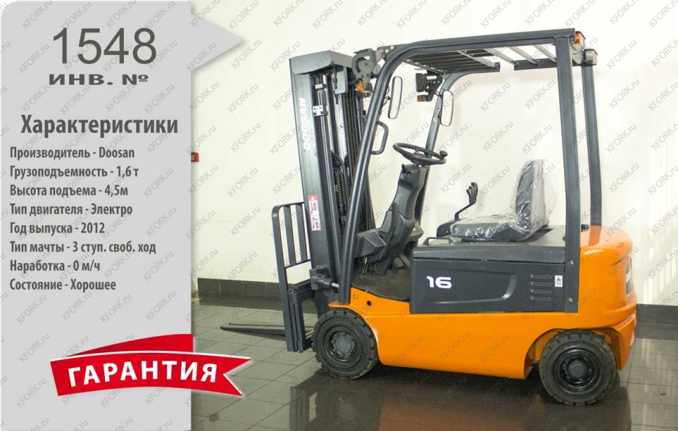 Электрический погрузчик Doosan Б/У с интентарным номером 1548 2012 года выпуска. Состояние - Хорошее. Имеет грузоподъемность 1600 кг. Гарантия: 1 мес или 200 м/час.
